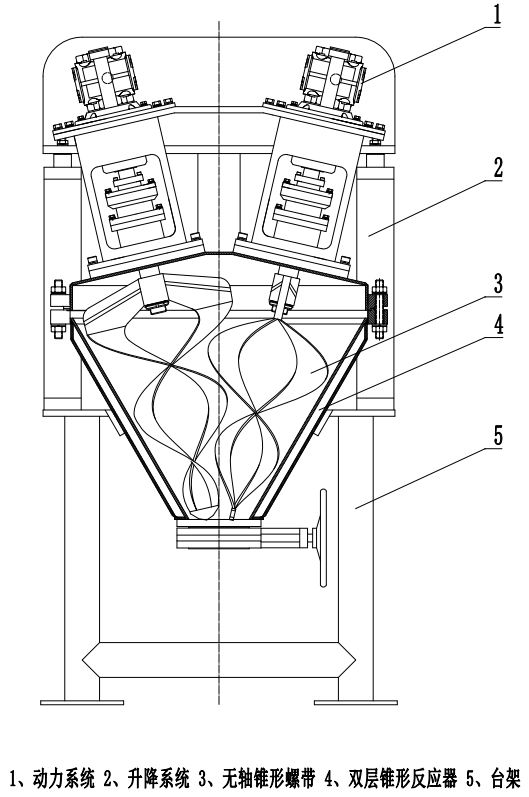雙錐體無軸螺帶混合裝置,雙層錐形殼體是為了調(diào)節(jié)反應(yīng)或混合溫度,在錐形反應(yīng)皿的外部 增加一個內(nèi)部中空的夾套用于通過熱媒或冷媒介質(zhì),從而對錐形反應(yīng)皿進行溫度調(diào)節(jié)。